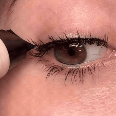 Einfach den Stempel an den äußeren Augenwinkel setzen, leicht andrücken und anschließend den Liner am Auge entlangziehen. Fertig!
